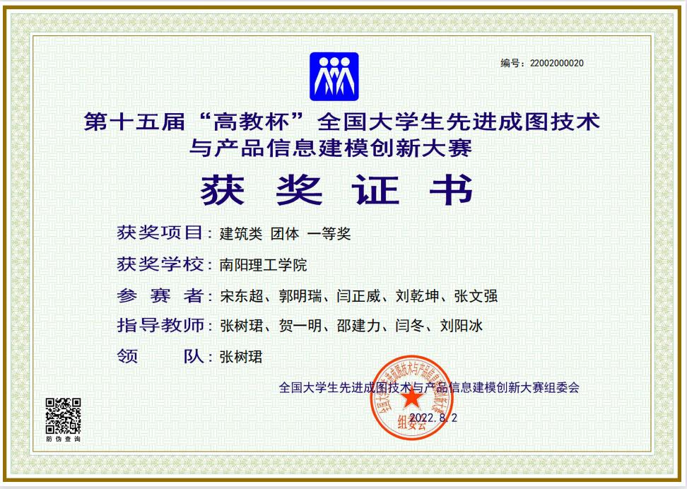 经过激烈的角逐,由贺一明、王爱风、王川、闫冬指导的南阳理工学院建筑学院与土木学院联队再创佳绩,获得建筑类团体一等奖的好成绩(取前五名成绩,我院占第1、2、5名),其中建筑学院个人全能共获奖13人,一等奖1人、二等奖6人、三等奖6人。
