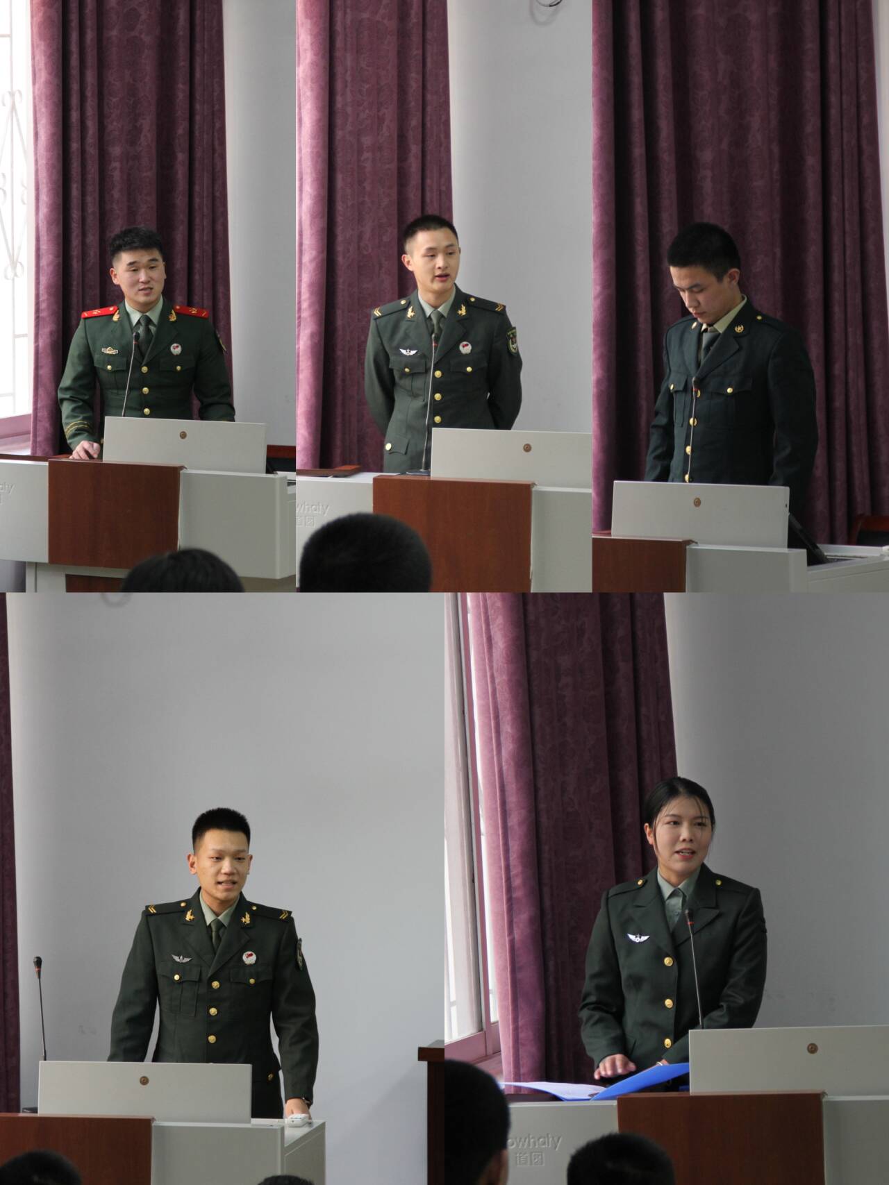 汪晴同学以“两年军旅路,一生受益处”为题,详细讲述了在参军期间的种种蜕变,从稚嫩到成熟是她最大的收获。张哲恺与李林凯同学,从自身经历谈及服役期间和退役后自身对于国家参军政策的理解,让同学们对相关政策更加了解。“铁血铸军魂”的裴力飞同学是中印边境冲突的亲历者,他用朴实的语言和真挚的情感述说了戍边战士陈祥榕、肖思远等英烈守卫祖国边疆的英勇场面和他在西藏驻守时的种种经历,现场同学们纷纷投来敬佩的目光。李昂同学则以“参军入伍,无限光荣”为题,动员同学们积极参军入伍,为无限精彩的青春增添一抹鲜亮的橄榄绿。