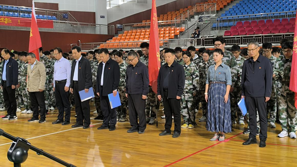 本网讯(特约记者/田真 学生记者/陈越)秋雨绵绵寄哀思,红旗飘扬唤深情。9月18日,“勿忘国耻,铭记九一八”爱国主义主题教育活动在东南体育馆二楼庄严举行。校党委副书记、工会主席董豪出席并讲话,相关职能部门负责人及全体军训连队师生到场参加。