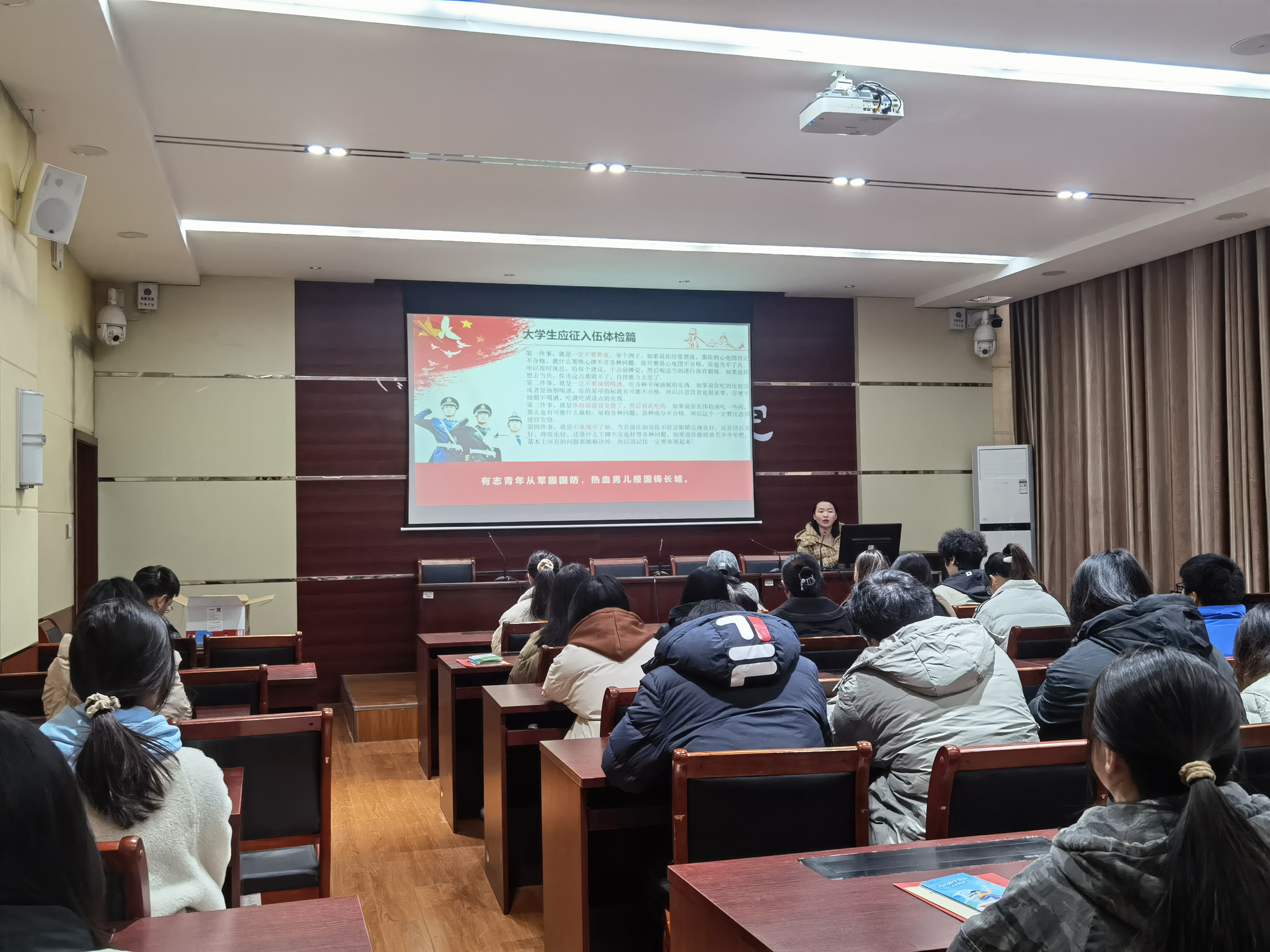 本网讯(记者/侯潇)为进一步增强大学生的国防意识,激发青年学生参军报国热情,建筑学院于12月31日召开了2025届毕业生征兵入伍动员大会,会议由团学办主任李欣主持,学院武装专干侯潇担任主讲,2025届毕业生到场聆听。